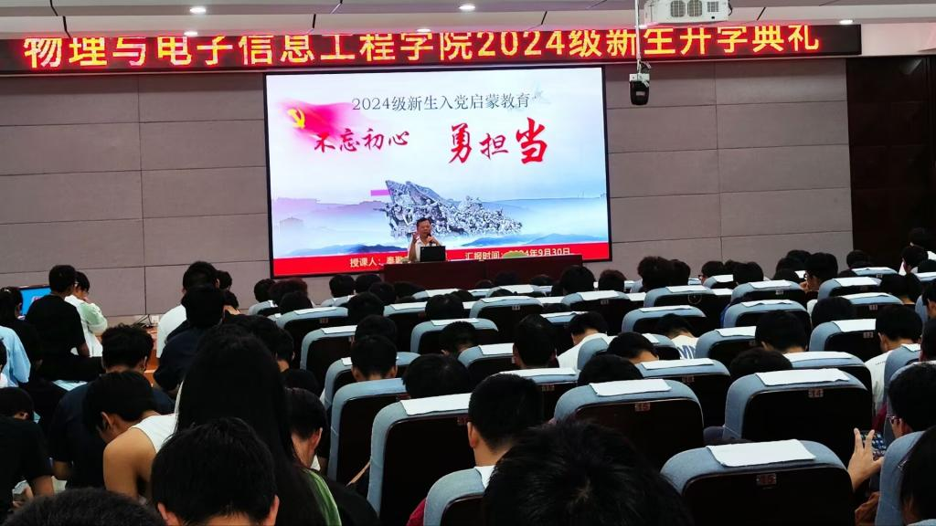 为深入学习贯彻党的二十大精神,引导新生树立正确的理想信念,太阳集团2007于9月30日在雁山校区举办了2024年新生入党启蒙教育。学院党委书记秦勤忠主讲,各学生党支部书记,全体2024级本科生、研究生新生参加了本次教育活动。 秦勤忠同志以中国共产党百年奋斗历程为主线,阐述了党的性质、宗旨和指导思想。他强调,新时代青年应深刻认识和理解新时代的伟大成就,增强民族自豪感;要牢记使命,为实现“两个一百年”奋斗目标而努力;要深刻理解"四个意识"、"四个自信"的重要内涵,永葆先进本色;要积极向党组织靠拢,在学习和工作中不断提升自我,为党和人民事业贡献青春力量。 此次入党启蒙教育进一步增强了新生对党的认识,激发了同学们的入党热情。进一步加强新生思想政治教育,夯实理想信念根基,为培养德才兼备、勇于担当民族复兴大任的时代新人打下了坚实基础。 现场图片(一) 现场图片(二) (一审:夏琳,二审:蒋琼,三审:秦勤忠)