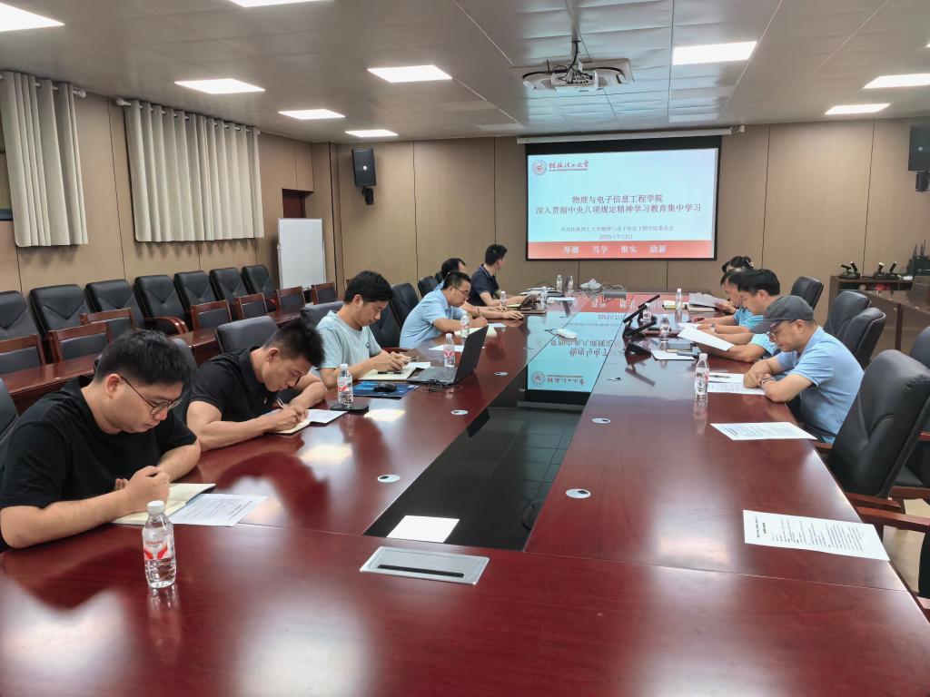 为深入贯彻中央八项规定精神学习教育,太阳集团2007党委于7月3日下午在雁山校区07424会议室召开党委中心组(扩大)理论学习会。会议由学院党委书记秦勤忠主持,学院党委理论学习中心组成员参会,学院非党员领导干部、院长助理、年轻干部以及各党支部书记列席会议。 会议首先集中观看专题片《八项规定改变中国》,系统回顾党的十八大以来作风建设的显著成效与宝贵经验。随后,秦勤忠同志领学习近平总书记在贵州、云南、河南考察时的重要讲话精神。院长董明刚领学习近平总书记在《求是》发表的重要文章,聚焦党的自我革命主题,阐释加强作风建设的本质要求。 蒋琼副书记通报《云南省曲靖市统计造假,政治生态恶化的典型案例》,以案为鉴剖析问题根源,警示党员干部筑牢纪律防线、抵制形式主义和虚假政绩观。年轻干部黄嘉结合专题片分享观看心得、年轻干部夏琳作“作风建设永远在路上”的学习分享。 最后,秦勤忠要求全体党员干部严格对标学习教育方案,一体推进学查改,强化政治担当,确保学有质量、查有力度、改有成效,为学院发展营造风清气正的政治生态。 现场图片(一) 现场图片(二) 现场图片(三) (一审:夏琳,二审:蒋琼,三审:秦勤忠)