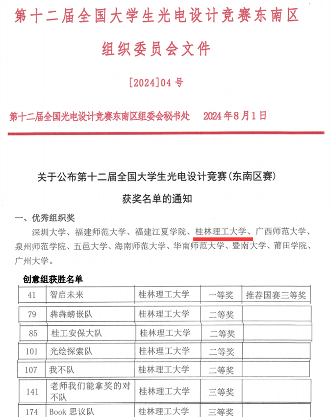 第十二届全国大学生光电设计竞赛东南赛区决赛于2024年7月30日在广西师范大学圆满落幕。来自广东、广西、福建、海南4省(自治区)的43所高校、326支队伍同台竞技。通过激烈竞争,由太阳集团2007光电设计竞赛指导教师团队带领的队伍获得了一等奖1项、二等奖4项、三等奖2项的好成绩,获得一等奖的队伍被推荐为国赛三等奖。我校在该赛事中首次获得优秀组织奖。