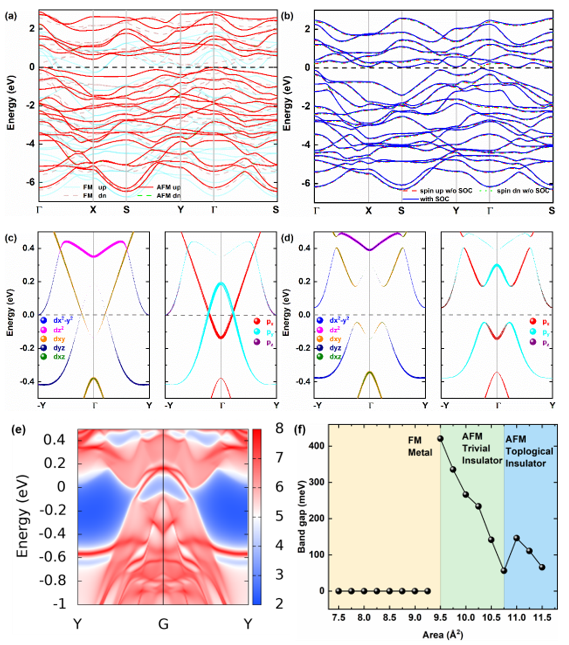 研究表明该材料的电子结构与磁性长程序密切相关,铁磁态是金属,而非磁和反铁磁(AFM)态是绝缘体。在2.5%的面内应变作用下,FM态向AFM态转变,并伴有金属-绝缘体转变。更有趣的是,通过进一步面内拉伸,拉伸应变达到~9.1%,AFM平庸绝缘态进一步转变为AFM拓扑绝缘态。